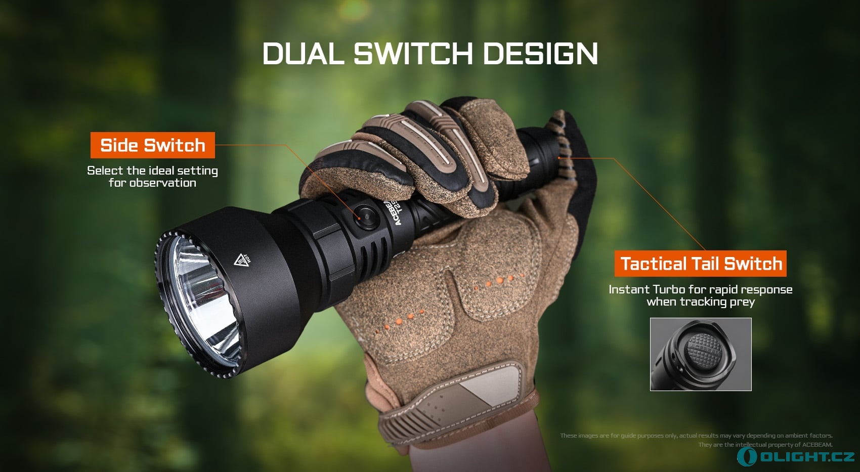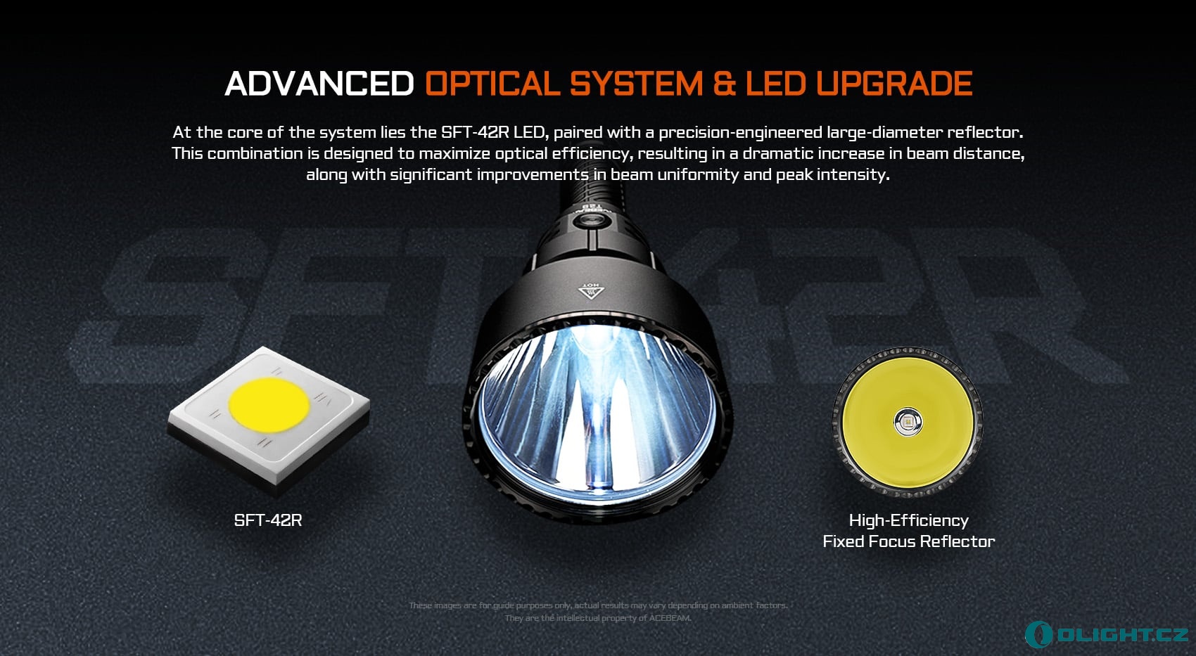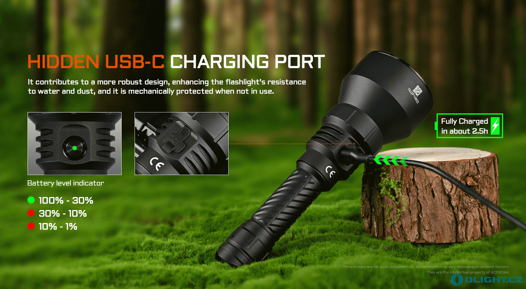 - Používejte pouze kvalitní vysokoproudové akumulátory (High Drain), jako je přiložený článek Acebeam, aby bylo dosaženo maximálního výkonu.