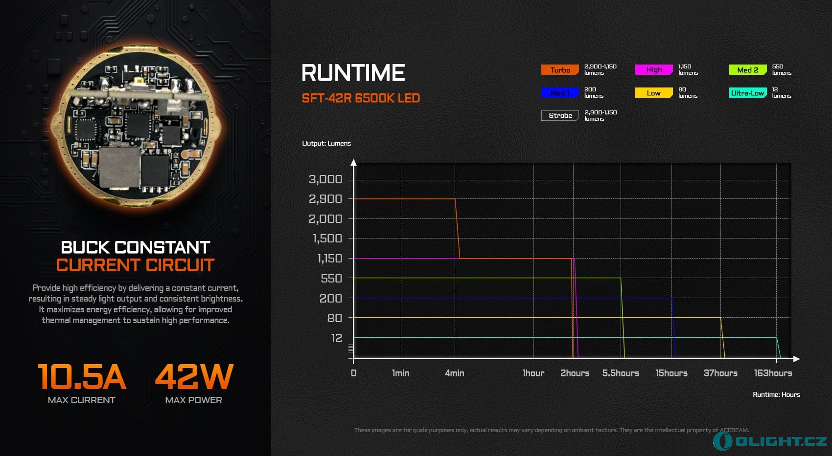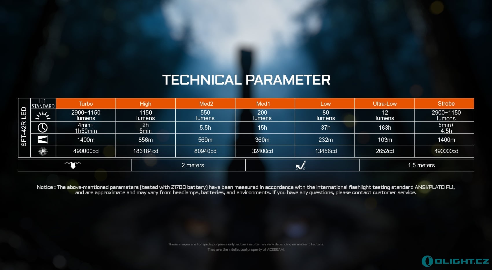 - Sedm režimů svícení: 2900 lumenů (4 minuty, poté automatické snížení na 1150 lm, výdrž až 1 hod 50 min) - 1150 lumenů (2 hod 5 min) - 550 lumenů (5,5 hodiny) - 200 lumenů (15 hodin) - 80 lumenů (37 hodin) - 12 lumenů (163 hodin).
