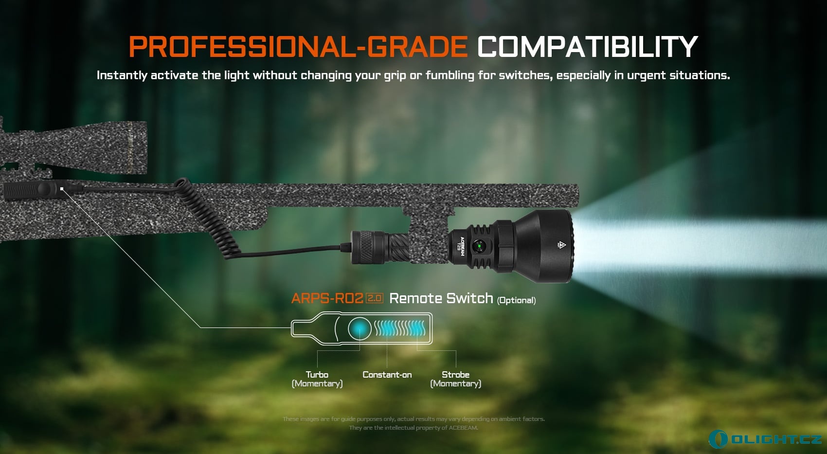 - Jako volitelné příslušenství lze dokoupit dálkový tlakový spínač ARPS-R02 nebo zbraňové montáže.