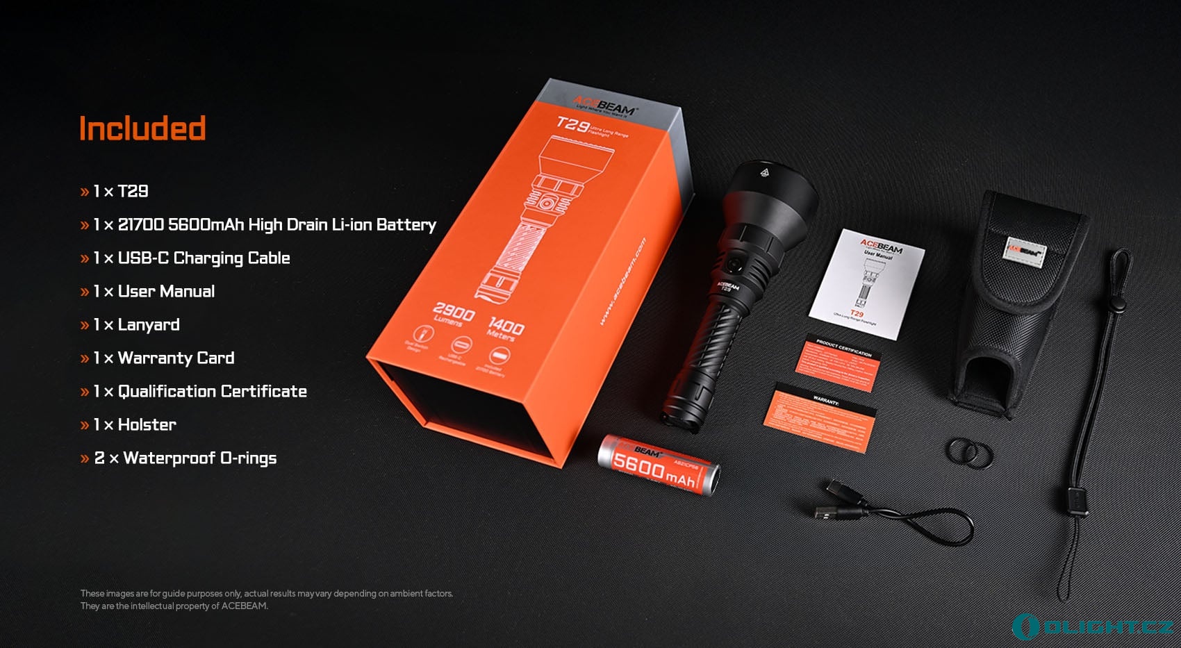 - Rozsah dodávky: svítilna Acebeam T29, akumulátor 21700 5600 mAh, nabíjecí USB-C kabel, poutko na ruku, náhradní o-kroužky, manuál.