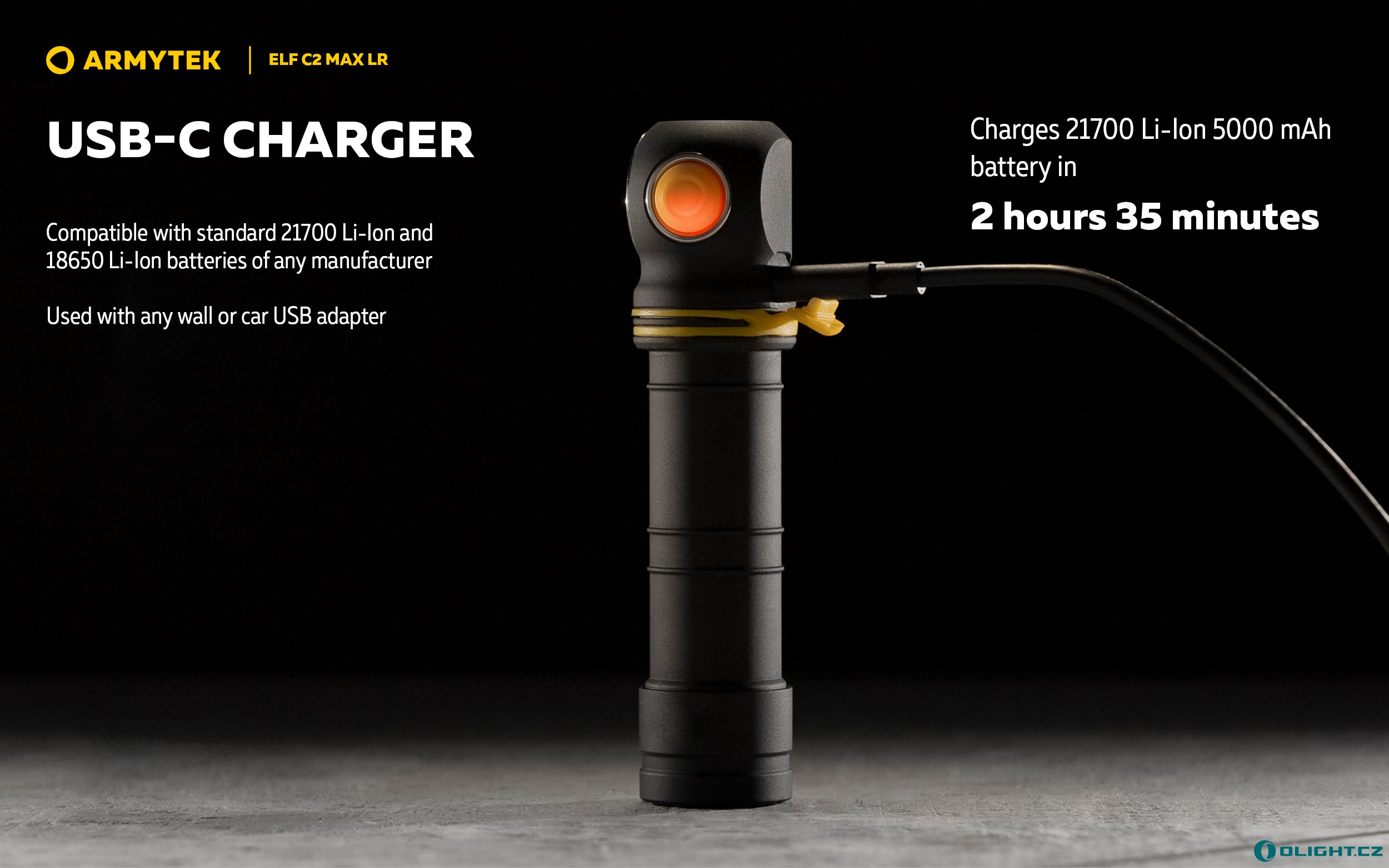 Odklopte gumovou krytku nabíjecího konektoru a zapojte přiložený kabel do svítilny (konektor USB-C), druhý konec kabelu zapojte do počítače, powerbanky nebo USB adaptéru. Během nabíjení svítí boční tlačítko červeně a po plném nabití se rozsvítí zeleně. Nabíjení baterie 21700 trvá díky inteligentnímu algoritmu pouhé 2 hodiny a 35 minut při využití USB zdroje o výkonu alespoň 10W (5 V / 2 A).