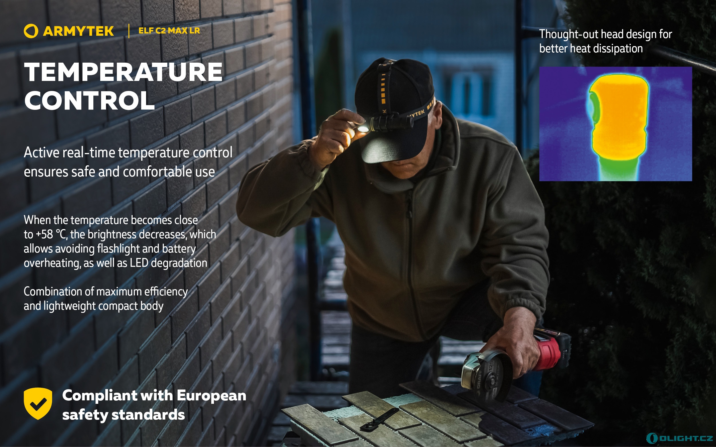 Upozornění na vysokou teplotu: Elektronika aktivně sleduje teplotu. Pokud přesáhne +58 °C, svítilna plynule sníží výkon, aby se ochladila, jakmile teplota klesne, výkon se opět zvýší.