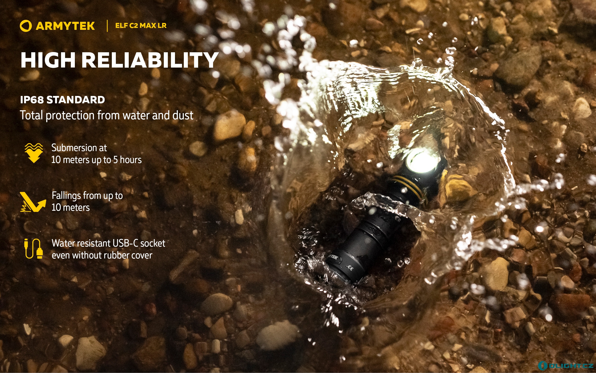 - Svítilna je vodotěsná dle standardu IP68 do hloubky až 10 metrů pod vodou (po dobu 5 hodin). USB-C konektor je voděodolný i bez krytky.