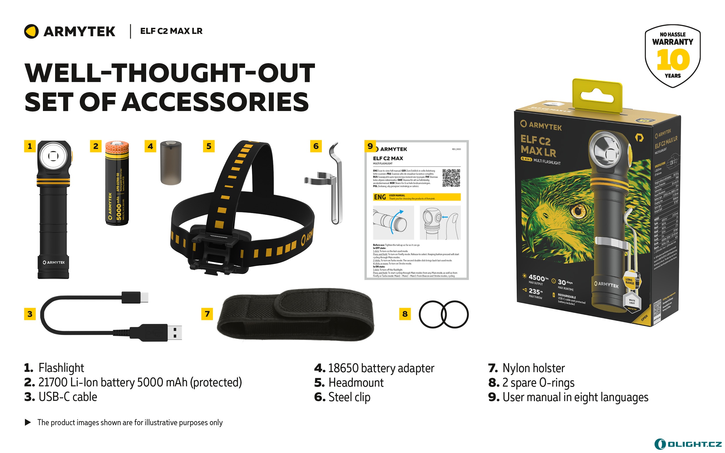 Záruka 10 let na čelovku, 2 roky na akumulátor.