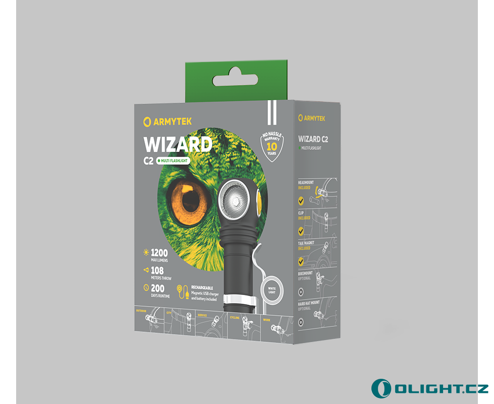 Čelovka Armytek Wizard C2 White nabízí světelný tok až 1200 lumenů. Světelným zdrojem je moderní LED Samsung LH351D, která v kombinaci se speciálně navrženým TIR kolimátorem vytváří mohutný světelný kužel s dosvitem až 108 metrů. Součástí balení je Li-ion akumulátor Armytek 18650 3200 mAh, který se nabíjí přímo v čelovce pomocí USB kabelu s magnetickým konektorem. Celkem svítilna nabízí šest funkcí svícení. Mezi pokročilé funkce patří i upozornění na vybité baterie a ochrana proti přehřátí. Armytek Wizard je špičkovou čelovkou pro běh, turistiku, cyklistiku, horolezectví, geocaching, rybolov a další aktivity.