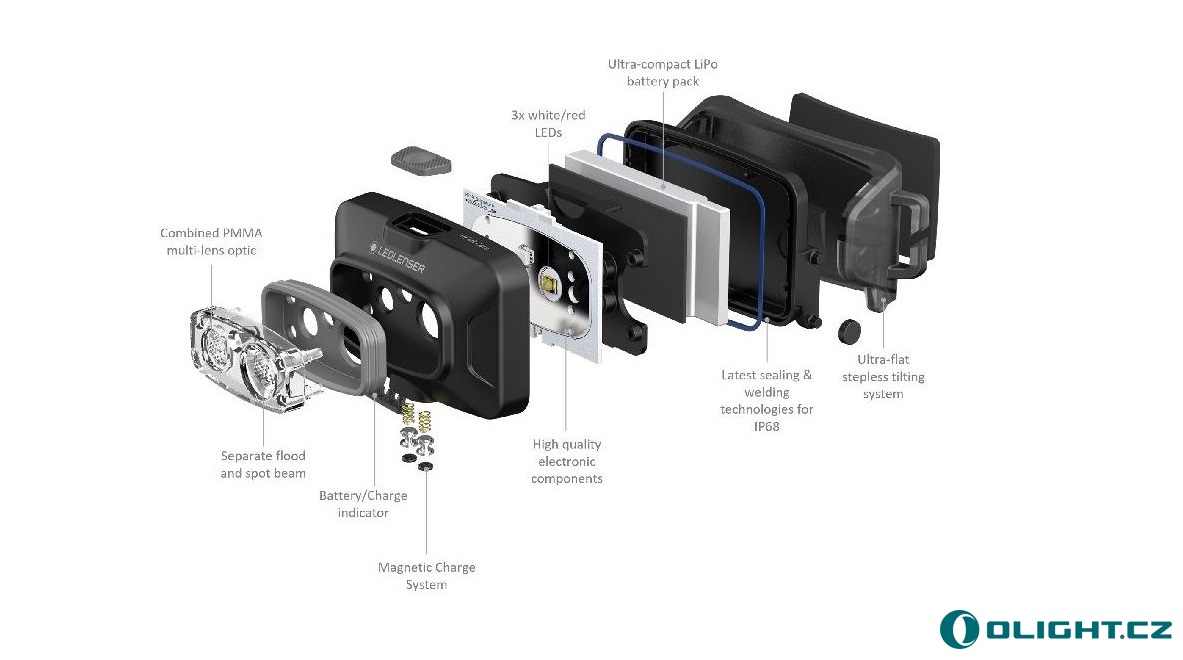 Plynule naklápěcí hlava lampy poskytuje maximální flexibilitu, zatímco štíhlý čelní pásek lze snadno přizpůsobit individuálním potřebám. Interní akumulátor s kapacitou 1000 mAh lze jednoduše nabíjet pomocí magnetického nabíjecího kabelu, který je součástí balení. Praktickou součástí svítilny je také indikátor stavu baterie.