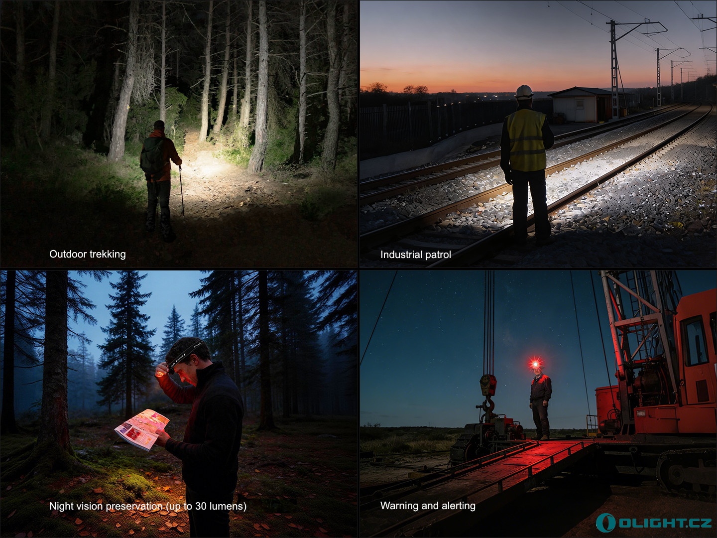 - Čtyři režimy červeného světla: 30 lumenů (6,5 hodiny) -> 10 lumenů (13,5 hodiny) -> 1 lumen (108 hodin) -> červené blikání 10 lumenů (/).