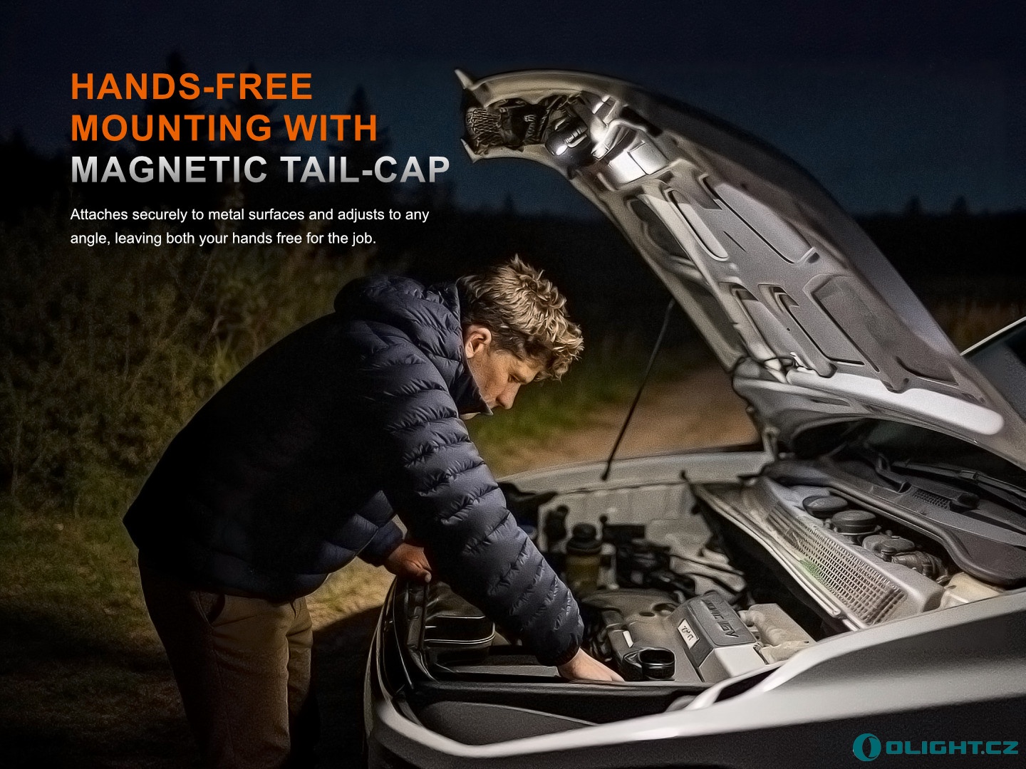 - Magnetická koncovka, čelovku lze upevnit na cokoliv železného.