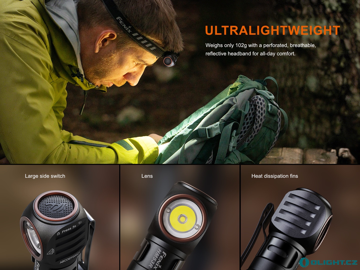 - Komfortní perforovaný popruh. U šedo-oranžové verze je vybaven reflexními prvky, u černé verze čelovky je bez reflexních prvků.