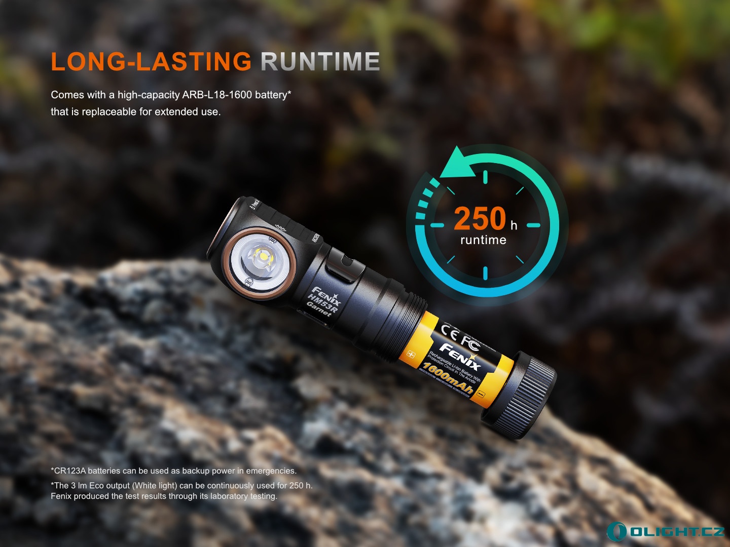 - K napájení lze nouzově použít i Li-ion akumulátor RCR123A, příp. jednorázovou lithiovou baterii typu CR123A s omezeným max. výkonem na 150 lumenů (nesnažte se je v čelovce dobíjet).