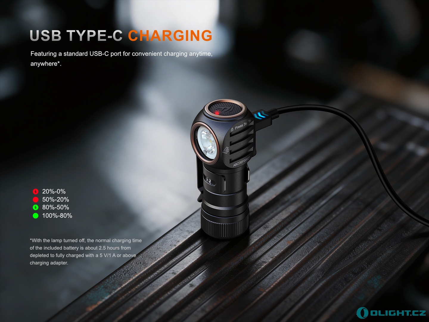 - Nabíjení přes USB-C konektor na boku čelovky, doba nabíjení zcela vybitého akumulátoru je cca 2,5 hodiny.
