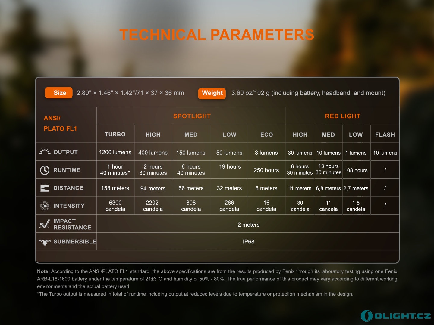 Všechny parametry svítilny (světelný tok, doba provozu na baterie, vodotěsnost, dosvit a nárazuvzdornost) jsou změřeny v souladu s normou ANSI/NEMA FL 1-2009.
