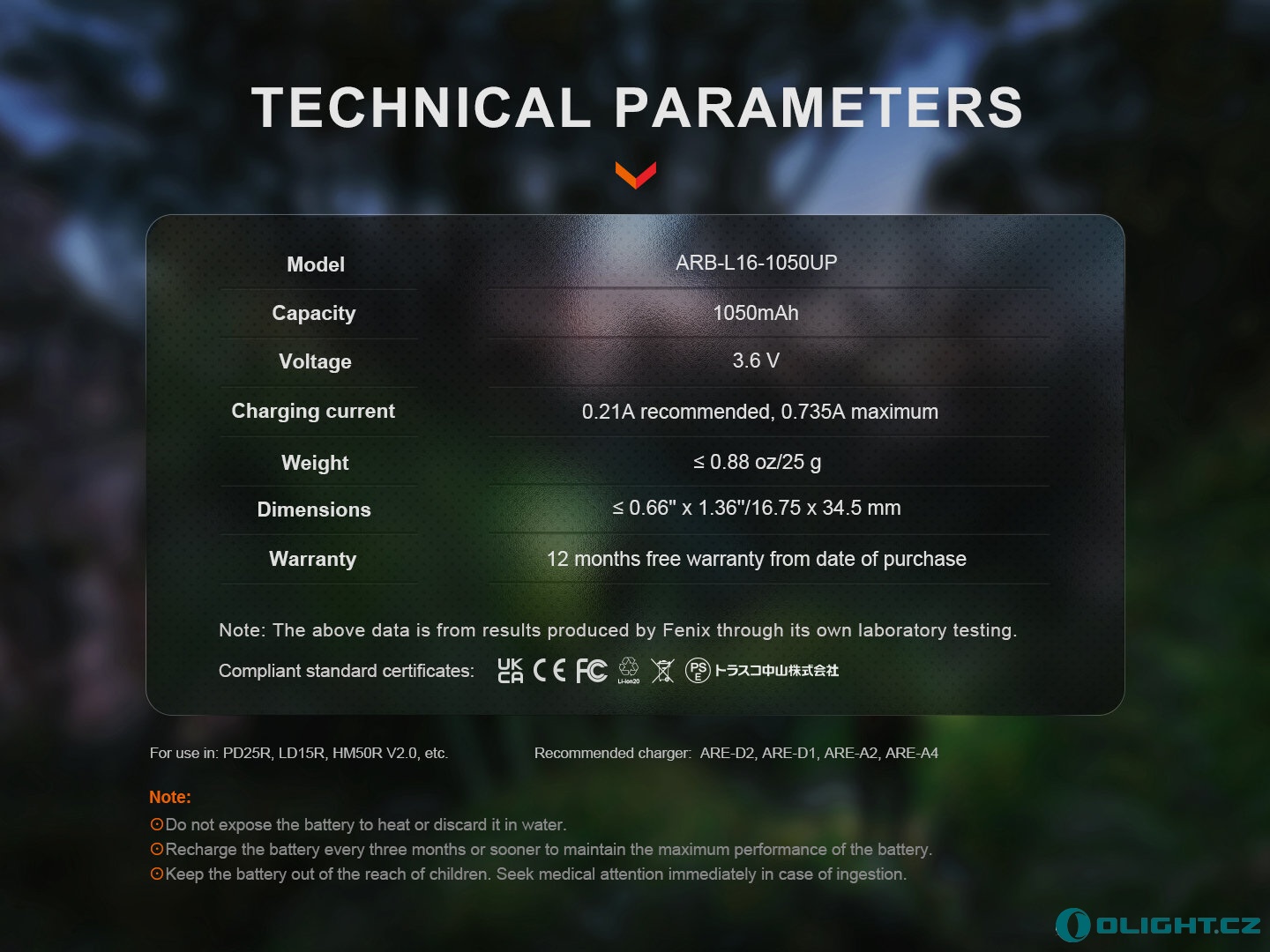 POZOR – nepoužívejte ve starších modelech: Fenix E15 (neplatí pro verzi XP-G2), PD10, PD12, PD20, PD22 (neplatí pro Ultimate Edition) a HL50. Vyšší napětí by mohlo poškodit jejich elektroniku!