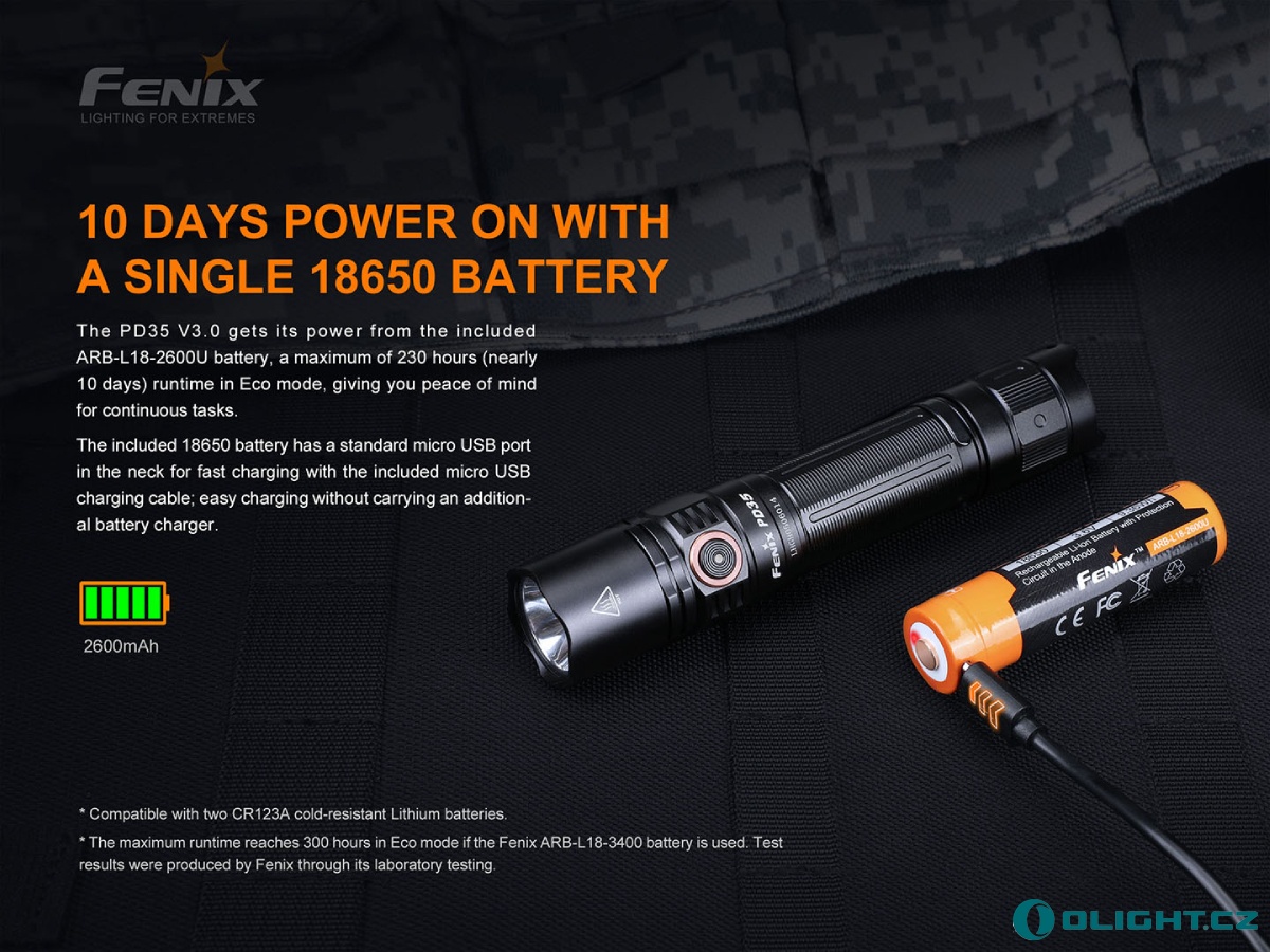 Nejnovější generace vysoce výkonné kapesní svítilny Fenix PD35 V3.0 přináší světelný tok až 1700 lumenů (ANSI) a dosvit až 357 metrů. Výborného světelného výkonu bylo dosaženo použitím nejnovější LED Luminus SFT-40. Svítilna je napájena z Li-ion 18650 2600 mAh akumulátoru (součástí balení), s vlastním nabíjecím micro-USB konektorem. Fenix PD35 V3.0 disponuje šesti různými režimy svícení, které umožní volit mezi vysokým výkonem a dlouhou výdrží, která dosahuje až 230 hodin. Jedním ze světelných režimů je i stroboskop, který se hodí pro krizové situace. Svítilna je napájena digitálně regulovaným konstantním proudem pro zaručení stálého světelného výkonu i při snižování napětí v bateriích (při jejich pozvolném vybíjení), kdy je zároveň také vybavena indikací stavu nabití baterií. PD35 V3.0 zaujme nejen malou velikostí a vysokým výkonem, ale i taktickým spínačem a možností připevnění kabelového spínače Fenix AER-02. Můžeme ji proto doporučit nejen pro všechny outdoorové nadšence, ale najde jistě využití i v bezpečnostních složkách a pro myslivost.