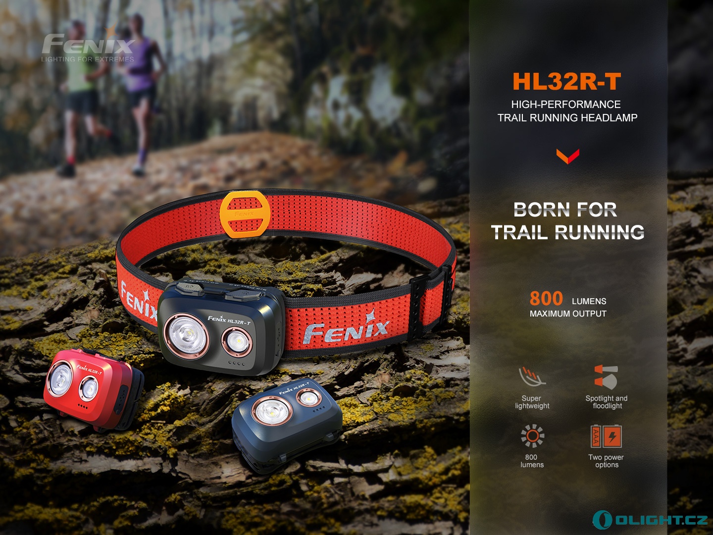 Běžecká nabíjecí čelovka Fenix HL32R-T se vyznačuje nízkou váhou a unikátní konstrukcí se dvěma reflektory. Hlavní reflektor vytváří dobře zaostřený světelný paprsek s výkonem až 800 lumenů a dosvitem až 132 metrů. Druhý reflektor s výkonem 200 lumenů má světelnou stopu velmi širokou a plynulou s dosvitem 30 metrů, navíc má teplejší odstín světla (neutral white). Výhodou tohoto odstínu světla je přirozenější a kontrastnější podání barev v přírodě. Ovládání obou LED je na sobě nezávislé (kužely však nelze kombinovat). K napájení slouží jeden Li-ion akumulátor ARB-LP1900 s kapacitou 1900 mAh, který je součástí balení a nabíjí se přes moderní USB-C konektor přímo v čelovce. Akumulátor je možné vyjmout a v nouzi nahradit třemi běžnými bateriemi AAA (nelze je v čelovce nabíjet).