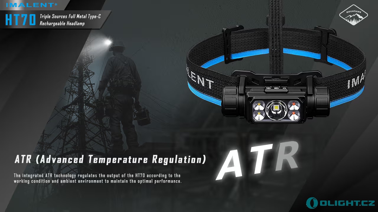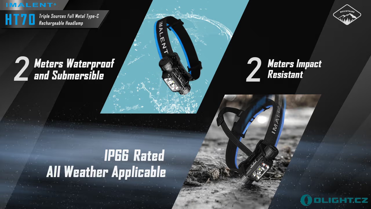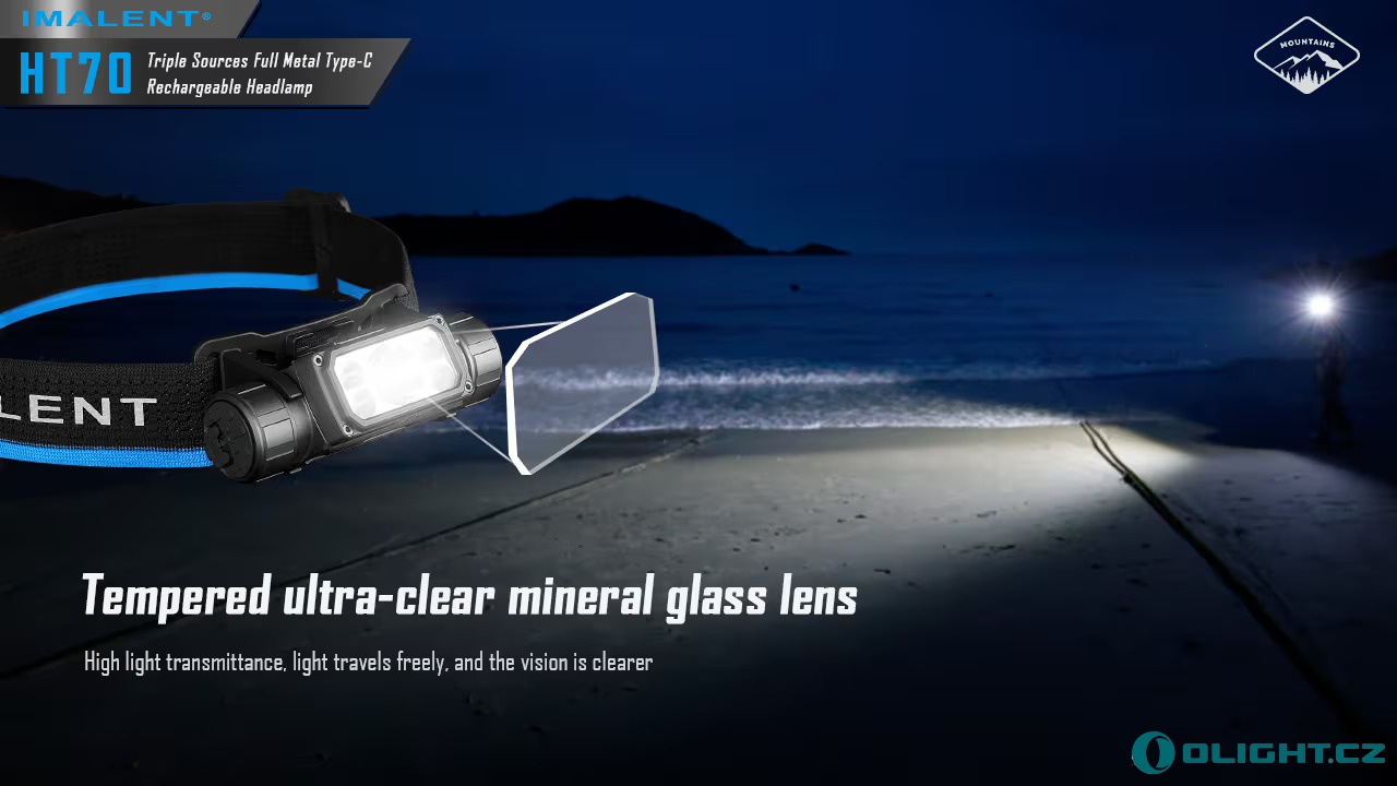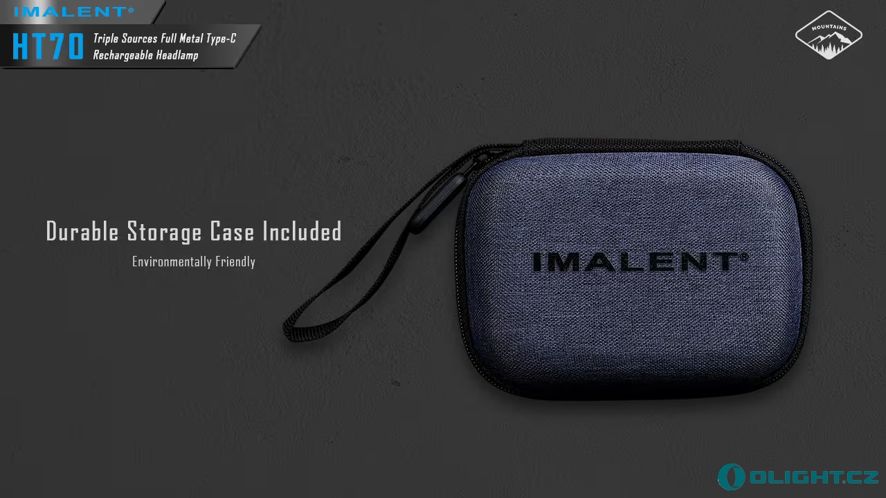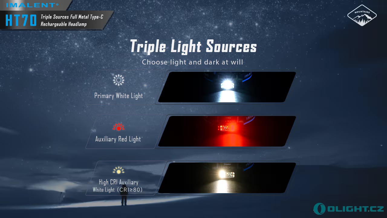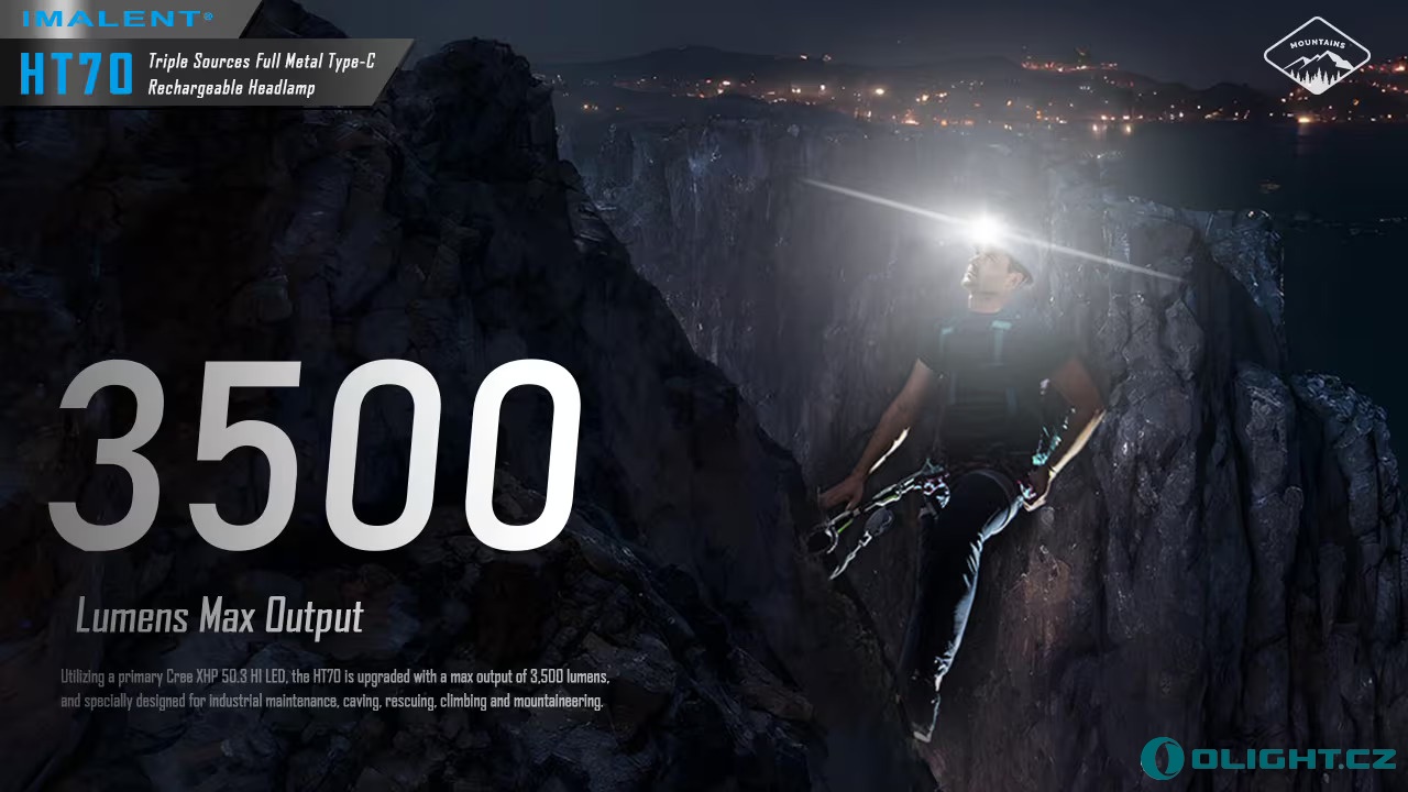 Špičková nabíjecí čelovka Imalent HT70 byla navržena jako kvalitní zdroj světla s vysokou odolností v outdoorových i průmyslových podmínkách. V hlavním dálkovém reflektoru je osazena extrémně výkonná LED Cree XHP50.3 HI, jež dosvítí na vzdálenost až 349 metrů při maximálním světelném toku 3500 lumenů. Dálkové světlo najde využití zejména při různých pátracích, ostrahových a kontrolních činnostech. Pro ostatní případy lze přepnout na dvojici doplňkových LED Cree s širokým kuželem světla pro osvětlení blízkého okolí. Mají teplý odstín (~3500 K) a nadprůměrné CRI (>80 Ra), ve výsledku tak poskytují příjemnější světlo, které tolik nenamáhá oči. Nakonec je zde ještě dvojice červených LED s maximálním výkonem 80 lumenů, které lze použít pro zachování noční vize nebo jako blikající signalizaci.