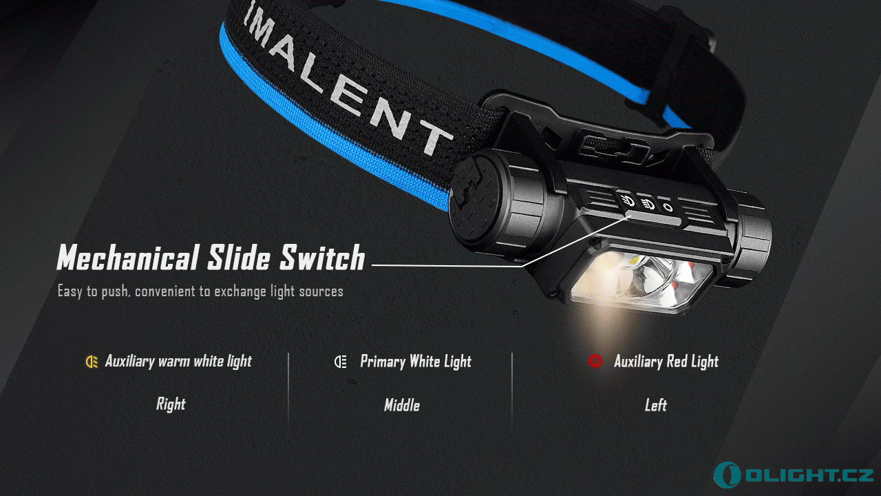 Mezi třemi typy světla (hlavní reflektor, teplé světlo a červené světlo) se přepíná posuvným voličem na vrchní straně svítilny.