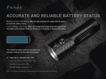 Indikace kapacity baterií - po zapnutí svítilny se na 3 vteřiny rozsvítí indikátor v tlačítku. Pokud indikační dioda svítí zeleně jsou akumulátory nabité na více než 85%. Zelené blikání znamená 50-85% kapacity. Pokud svítí červeně, jsou nabité na 25-50%. Červené blikání značí, že zbývá méně než 25% kapacity.