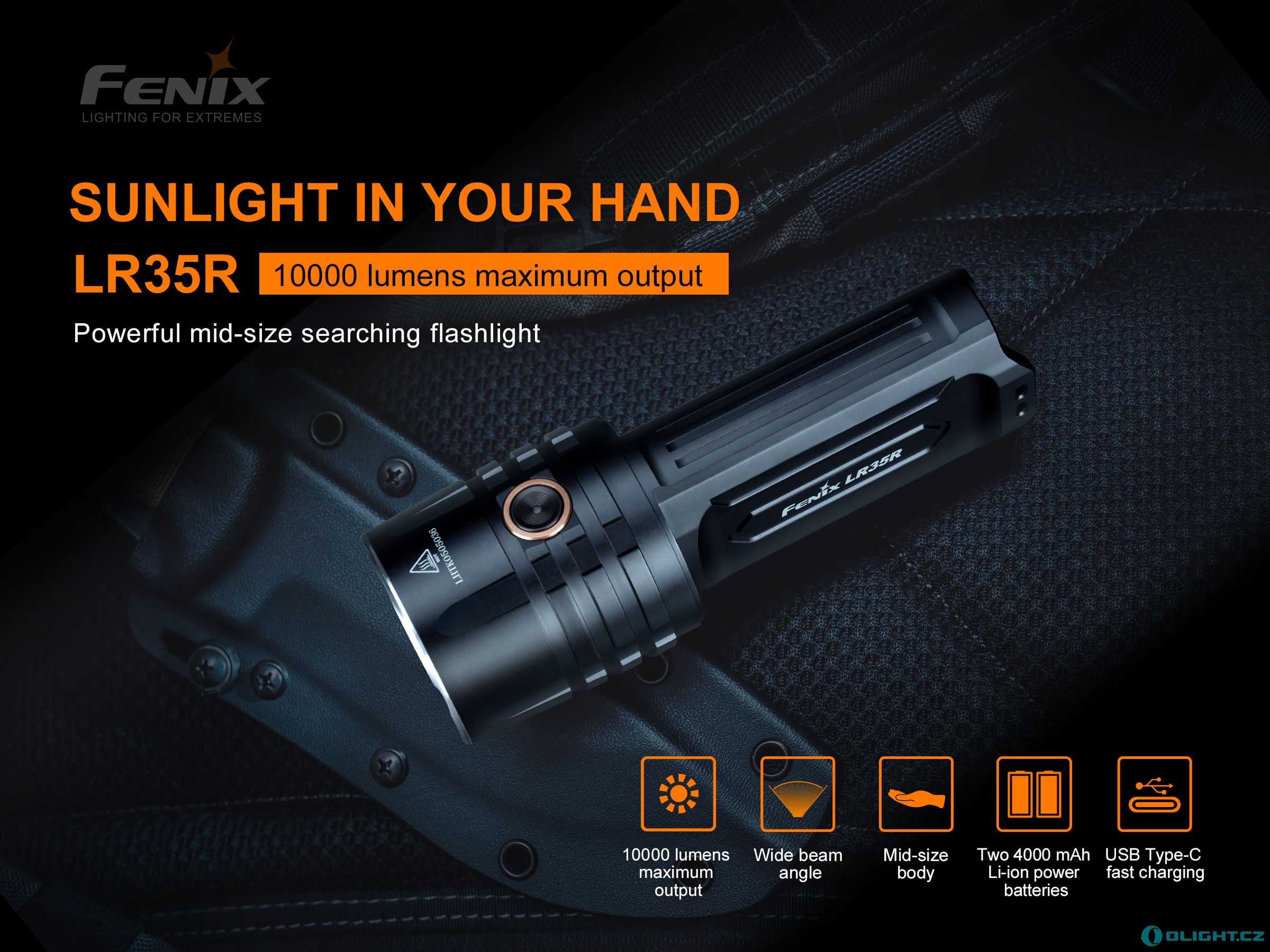 Nabíjecí svítilna Fenix LR35R přináší extrémní světelný tok až 10 000 lumenů (ANSI) a široký plynulý kužel s dosvitem až 500 metrů. Svítilna je napájena dvěma vysokoproudovými Li-ion akumulátory typu 21700 (součástí balení), které je možné nabíjet přímo ve svítilně přes moderní USB-C konektor. Mimořádného světelného toku bylo dosaženo použitím šesti vysoce výkonných LED Luminus SST-40. K dispozici je pět úrovní svícení a oslepující zábleskový režim strobe pro nouzové situace.