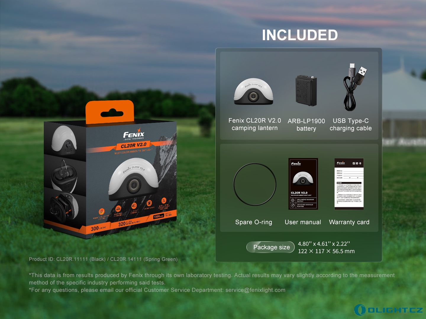 - K lampě je přiložen nabíjecí USB-C kabel, akumulátor Fenix ARB-LP1900, a náhradní o-kroužek.