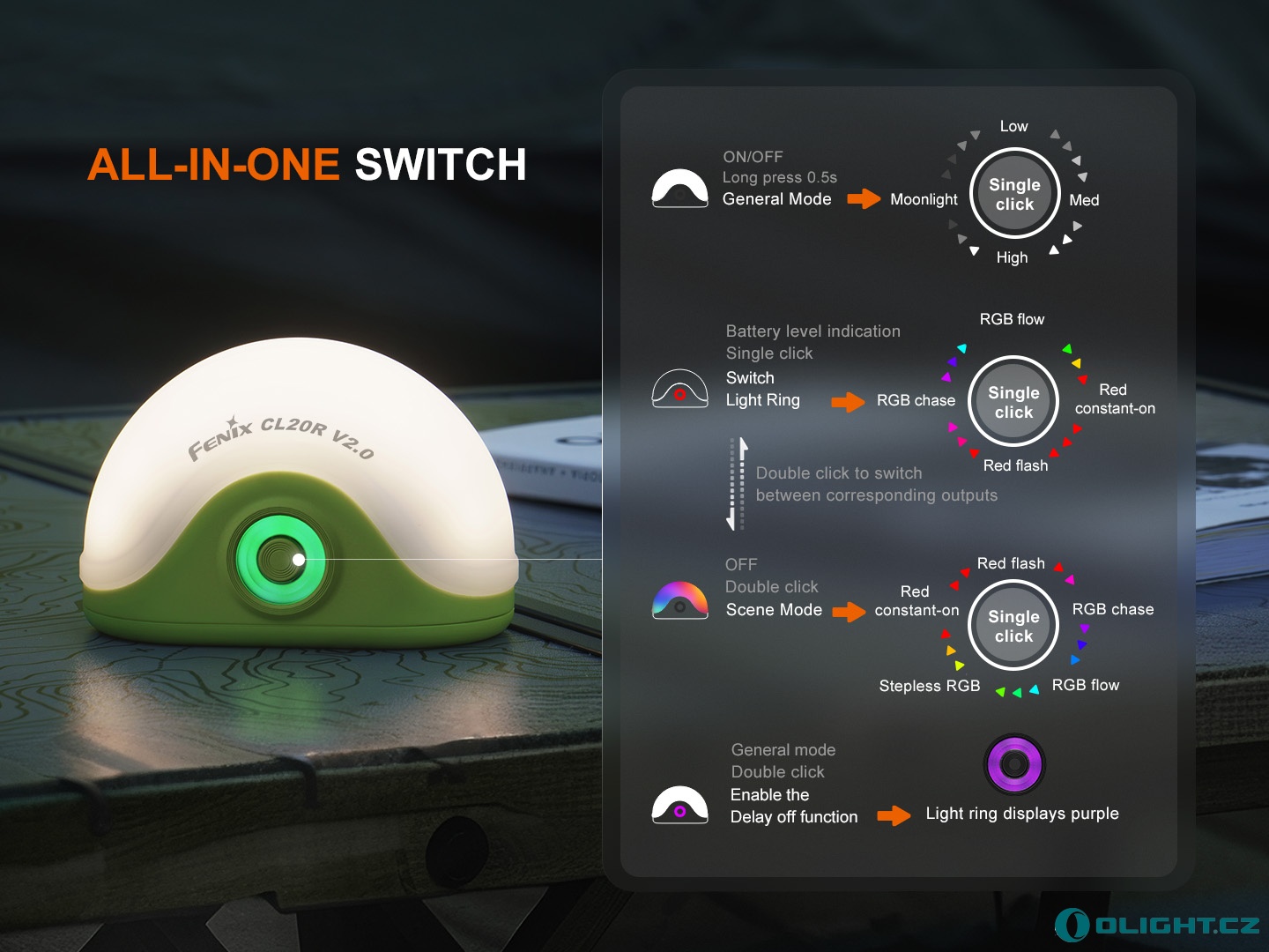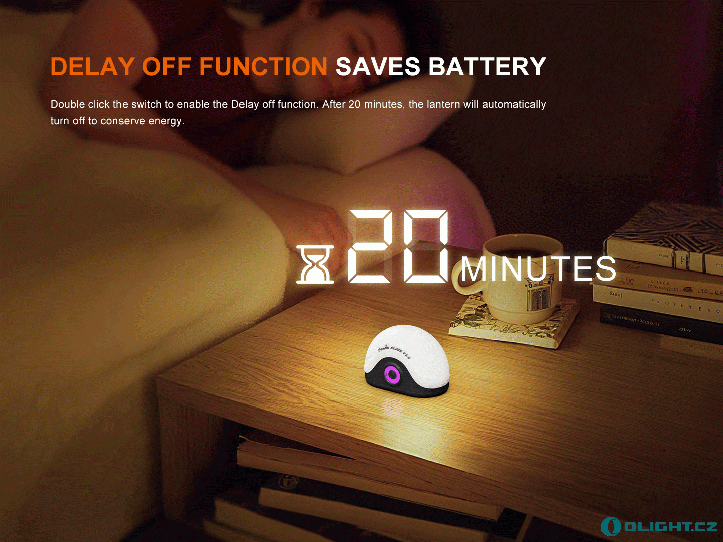 Přepínání způsobů svícení - Funkce odloženého vypnutí: Pokud je lucerna zapnutá do režimů bílého světla, dvakrát rychle stiskněte spínač, tím se aktivuje funkce odloženého vypnutí. Světelný prstenec spínače se rozsvítí fialově a lucerna se po 20 minutách sama vypne. Pokud je lucerna zapnutá do barevných režimů svícení nebo má aktivní barevný prstenec, tak mezi těmito dvěma způsoby svícení se přepíná dvojitým stisknutím spínače. Pokud je aktivní režim plynulé změny barev, pak dvojitým stisknutím spínače pozastavíte aktuální barvu nebo opět obnovíte plynulou změnu barev.