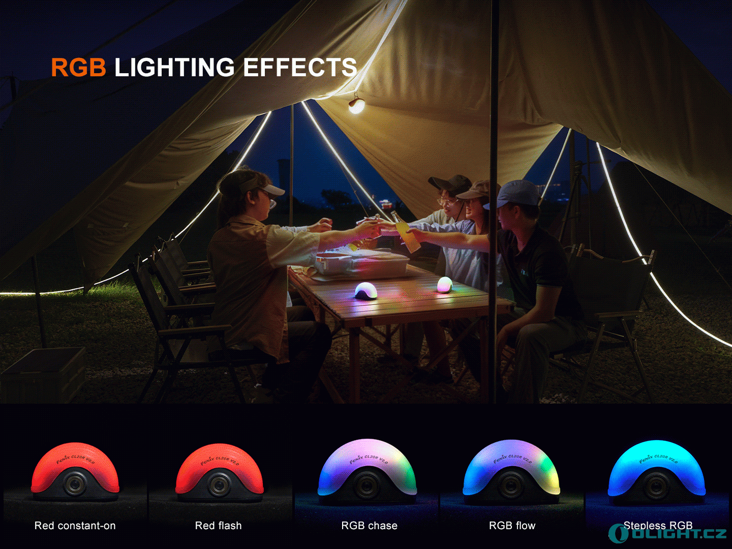 - Pět režimu červeného a RGB světla: RGB s plynulou volbou odstínu 25 lumenů (6,7 hodiny) -> RGB přebíhání 12 lumenů (10 hodin) -> RGB přelévání 10 lumenů (10 hodin) -> červené světlo 1,5 lumenu (40 hodin) -> červené blikání 1,5 lumenu (80 hodin).