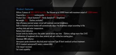 - Sedm režimů výkonu: 13000 lumenů (70 minut, po 45 vteřinách automatické snížení na 2000 lm) - 8000 lumenů (72 minut, po 60 vteřinách automatické snížení na 2000 lm) - 3000 lumenů (75 minut) - 1300 lumenů (2 hodiny) - 800 lumenů (3,7 hodiny) - 150 lumenů (27 hodin) - stroboskop (13000 lumenů).