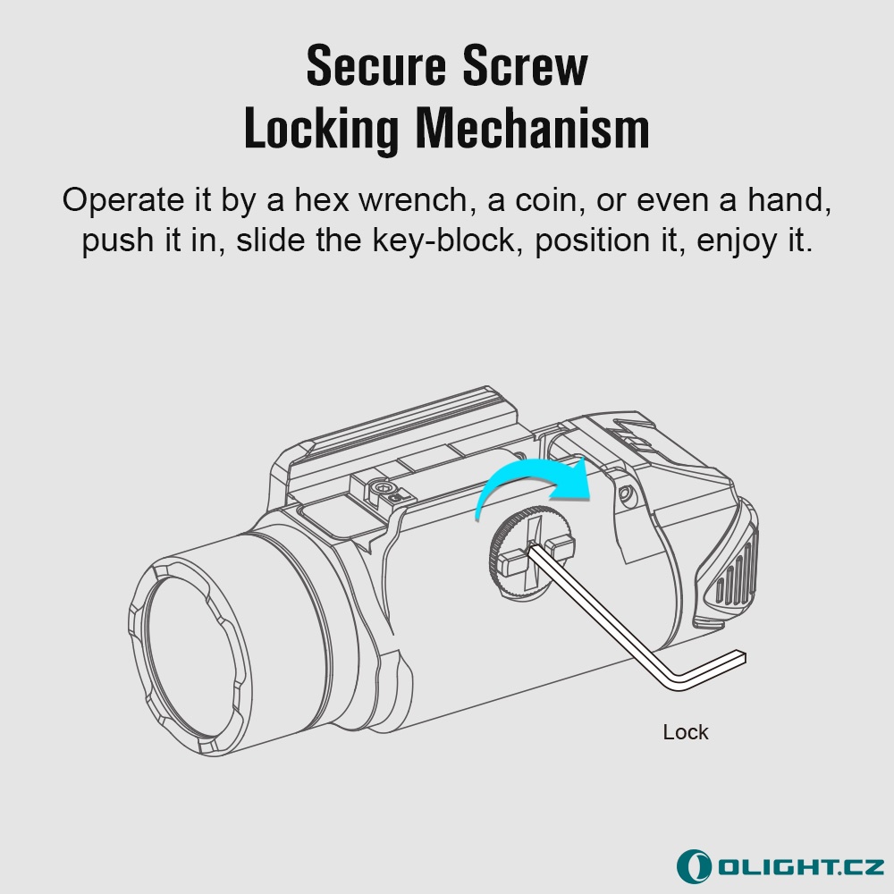 Montáž na pistoli - povolte šroub na boku, nasuňte svítilnu na zbraňovou lištu a zajistěte ji utažením šroubu. Můžete se si pomoci mincí nebo inbusem.
