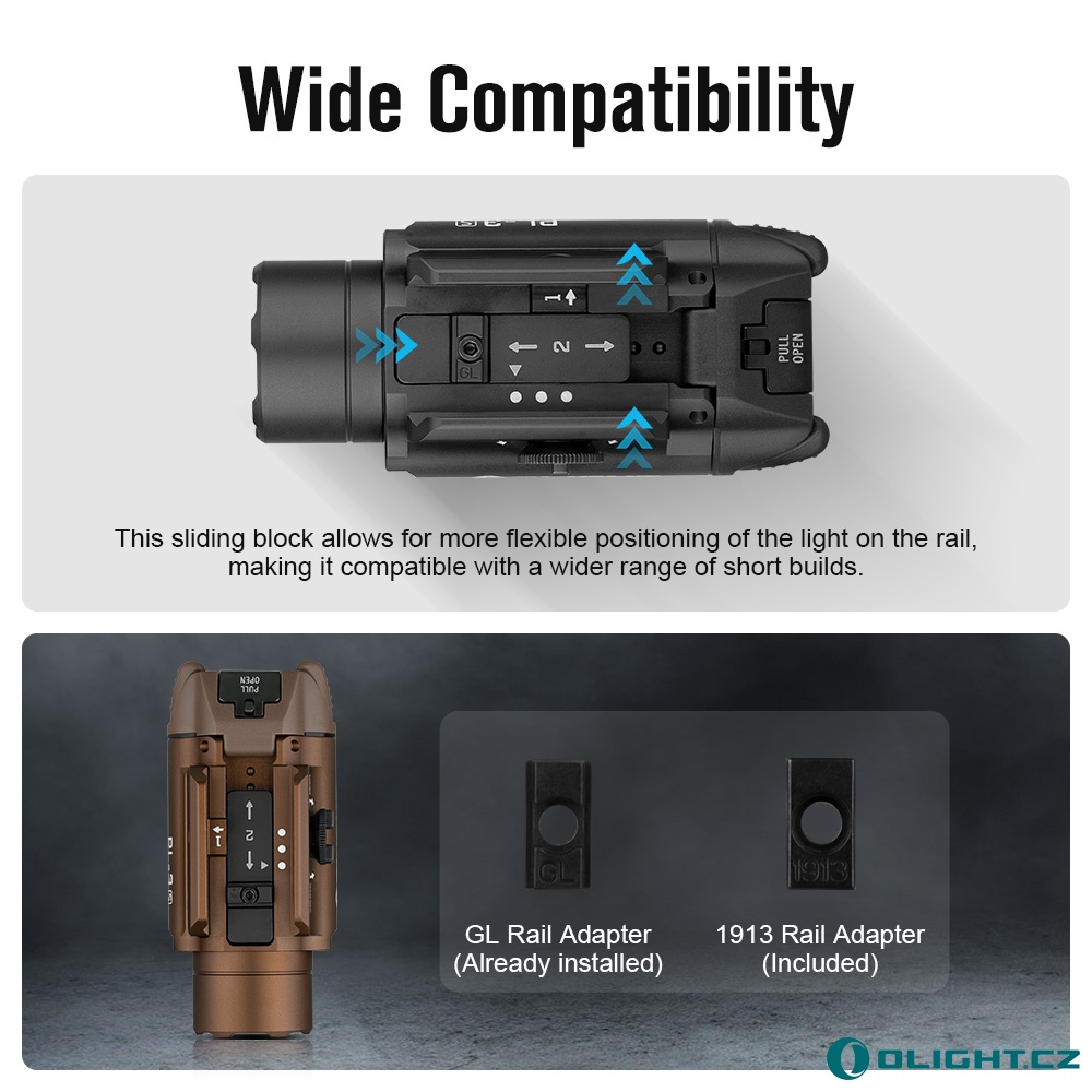 Svítilna nemusí pasovat na zbraně z kategorie slimline, např. model Glock 30 (pro ověřené zbraně vizte tabulku v obrázcích).